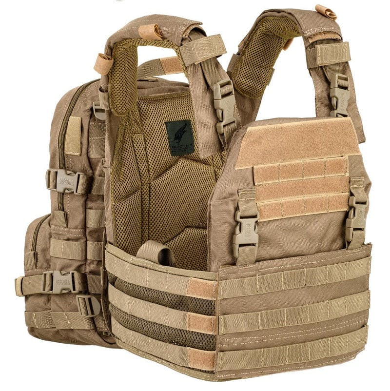 Tattico Plate Carrier Bav21 Coyote Tan con Zaino - Defcon 5. Gilet Tattico Molle leggero e compatto, costruito in Cordura 900 Denari e ogni cucitura è rinforzata per garantire la massima resistenza nei momenti di elevata attività.
