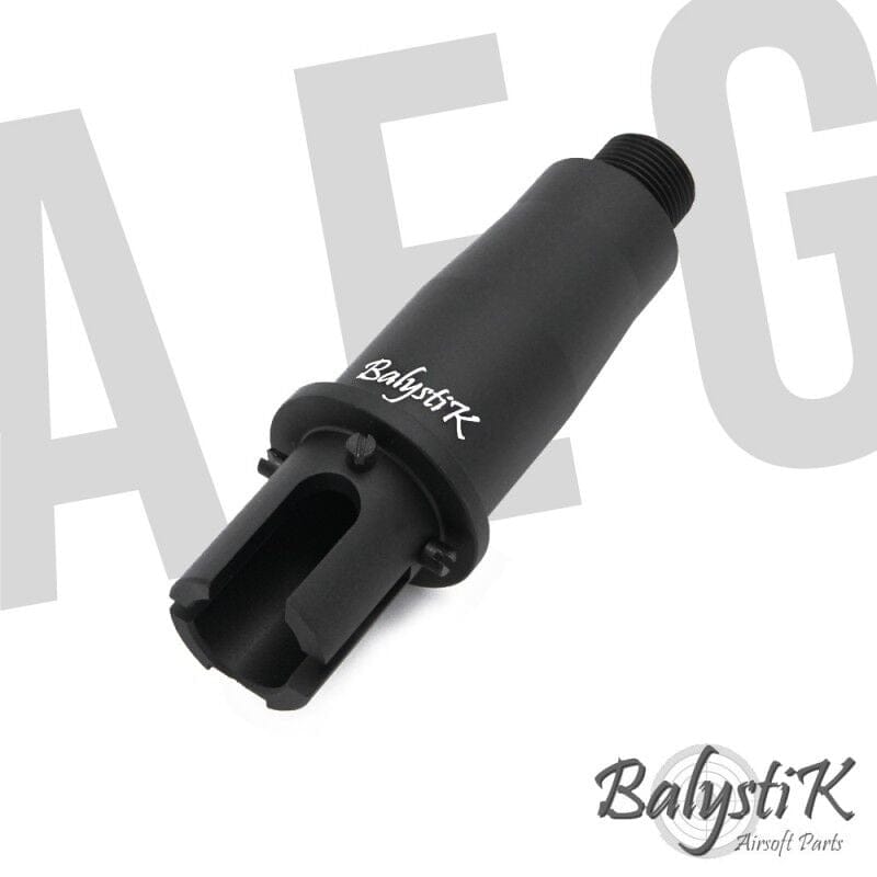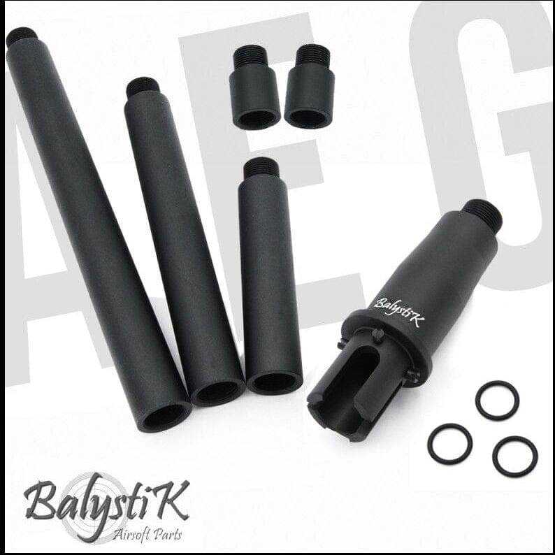 Kit Multi Outer Barrel, set Canne Esterne per M4 Aeg - Balystik. Canna esterna Balystik multi-configurabile per repliche airsoft Tokyo Marui M4 AEG. La base di montaggio superiore include tre alette per una maggiore stabilità e le estensioni esterne possono essere aggiunte insieme per ottenere una canna più lunga. Con la sua finitura nera extra opaca, la canna esterna Balystik è un'ottima opzione per le build personalizzate. Filettata in CCW da 14 mm.