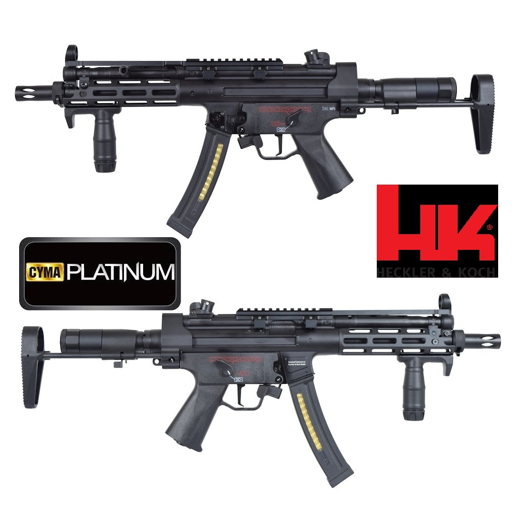 Fucile Elettrico MP5 M-lok su licenza Ufficiale HK by Umarex. Replica MP5 PDW Cyma Platinum. Goditi il campo di battaglia con il Fucile Elettrico MP5 PDW Cyma Platinum Custom. Grazie al design compatto e al calcio telescopico regolabile, potrai movimentarti con facilità. Calcio PDW in alluminio a 6 posizioni con vano batteria. Modello Custom con componentistica all'avanguardia, spessoraggio e ingrassaggio al joule