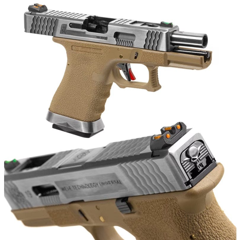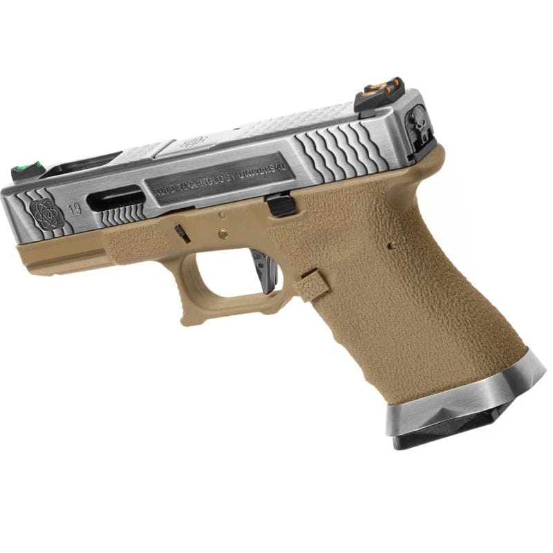 Pistola a Gas Glock G19 WE G-Force Tan con Carrello Silver. Modello Customizzato dalla casa madre WE che rende questa Glock ( già apprezzata da chi pratica softair per via della sua compattezza e manovrabilità nell'utilizzo) ancora più performante. In questo modello troviamo delle modifiche sia nell'estetica del prodotto che nella meccanica. La replica si presenta con un carrello alleggerito in metallo lavorato con macchinari ad alta precisione , logo con Teschio e serigrafie incise fanno da padrona e rendono questa Glock molto accattivante, inoltre è dotata di tacche di mira con fibra ottica che danno una migliore precisione di tiro anche con scarsa luminosità, Grip lavorata con stile Texture per una migliore presa ed ergonomia, parte finale con magwell in alluminio che bilancia perfettamente l'arma. Meccanicamente questa Glock possiede valvole di ultima generazione che permettono una pressione costante anche a basse temperature, la Glock g19 è dotata anche di un gruppo hop up regolabile e di un grilletto a corsa corta con sicura integrata di colore Rossa. Il funzionamento della pistola a gas è identico a quello reale ovvero: Inserisci il gas nel caricatore tramite valvola posta sotto nella basetta (Circa 5/6 sec.)metti i pallini facendo attenzione ad inserirli correttamente ( il caricatore è bifilare quindi ne andrà una a destra e uno a sinistra), il passo successivo è inserire il caricatore facendo attenzione e scarrellare il primo colpo ( per armare il cane interno ed inserire il pallino in canna ) e da li si può sparare in semiautomatico fino a quando non rimane il carrello in posizione aperta per indicare che sono finiti i colpi.