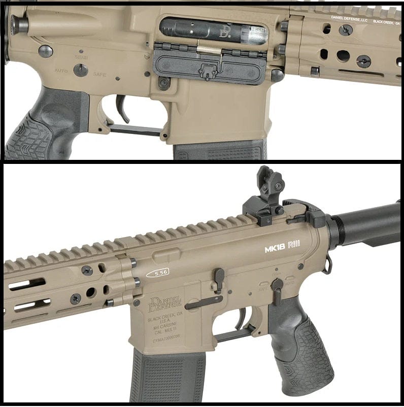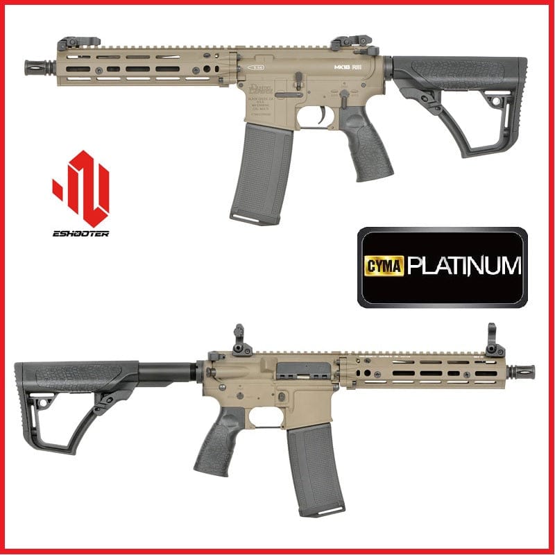 Daniel Defense MK18 R3 10,3 Pollici FDE - Cyma Platinum. Fantastica replica su licenza ufficiale by CYMA Platinum in colorazione Tan (FDE), progettata per chi ricerca prestazioni e affidabilità. Dotato di paramano RIS III con licenza e attacchi M-LOK, garantisce versatilità tattica e peso contenuto. L'ETU Eshooter V2 offre modalità di sparo personalizzabili e protezione del meccanismo interno. Equipaggiato con ingranaggi in acciaio 13:1, motore ad alta velocità e gearbox V2 rinforzato, assicura 360 FPS e una cadenza di 25 colpi al secondo. Componenti avanzati per durabilità e prestazioni costanti in campo. Il sistema Eshooter ETU V2 rappresenta il cuore tecnologico di questa replica, garantendo risposte rapide e affidabilità operativa. Questo mosfet avanzato gestisce modalità di fuoco versatili—raffica, tiro binario e pre-armamento—proteggendo simultaneamente batteria e meccanismi interni da sovraccarichi. La configurazione E-EDITION HIGH-SPEED di CYMA Platinum esprime il massimo delle prestazioni: 360 FPS e 25 RPS con batteria LiPo adeguata. Ingranaggi in acciaio 13:1 e gearbox V2 rinforzato assicurano durabilità sotto stress prolungato, ideale per chi esige affidabilità tattica senza compromessi.