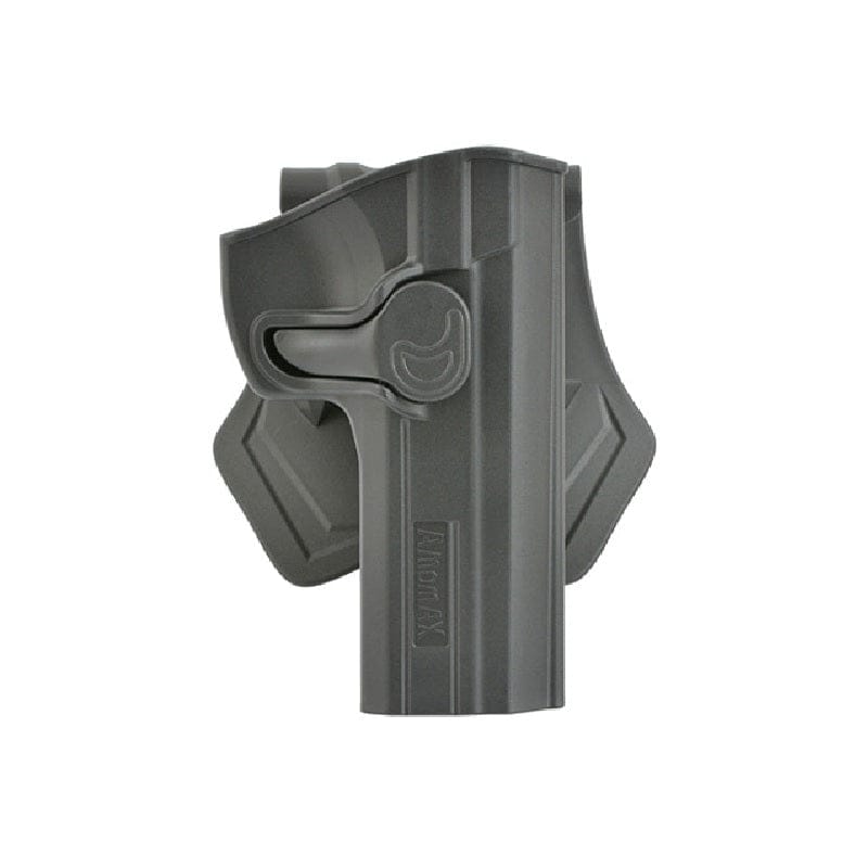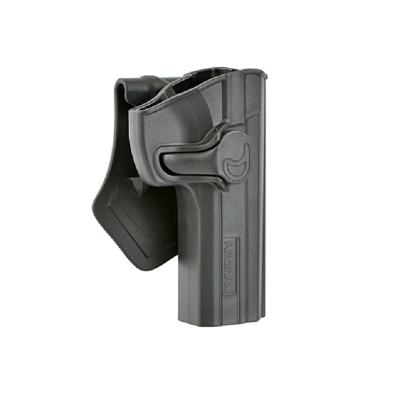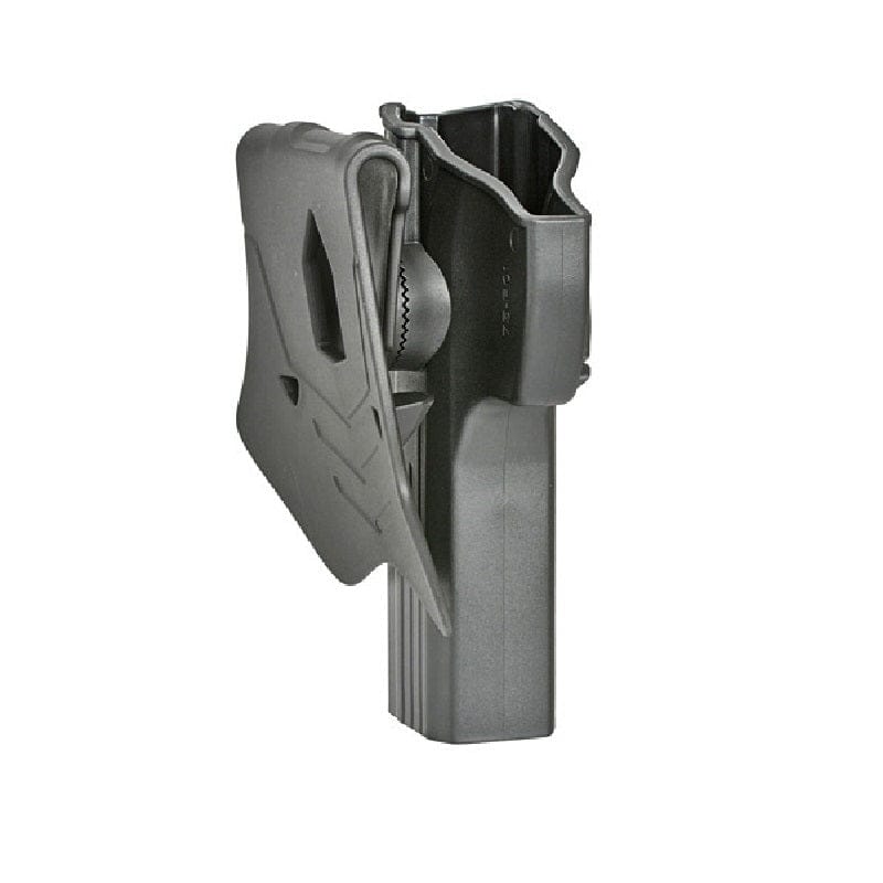 Fondina Rigida per pistola CZ 75 Shadow Sp-01 - Amomax. Serpa per replica CZ 75. Realizzata in polimero rinforzato. Orientabile a 360 gradi tramite ghiera con fissaggio a vite. Sistema di ritenzione con pulsante di sgancio rapido. Fondina con aggancio a cinturone sostituibile con gancio a molle, cintura, cosciale.