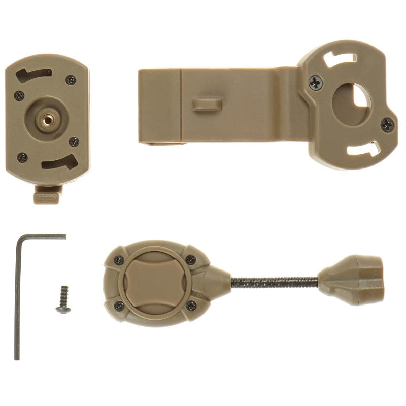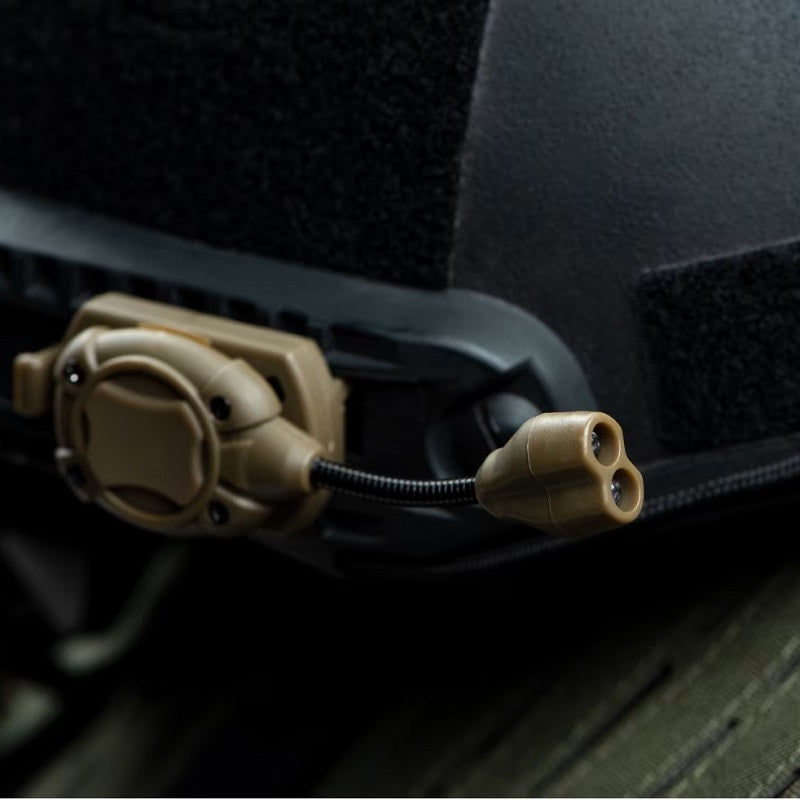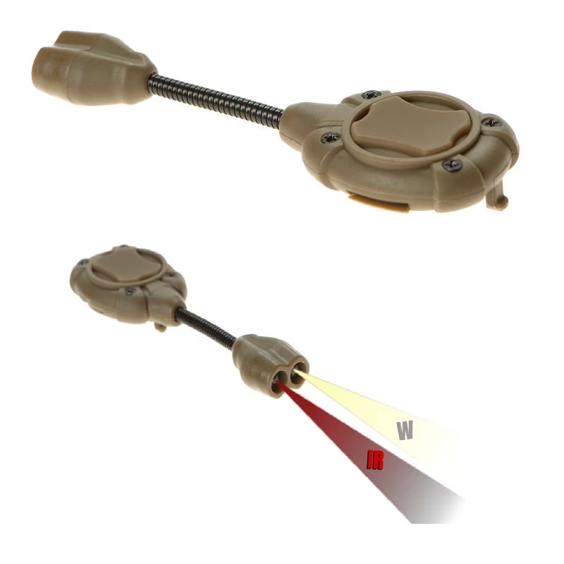 MPLS Torcia Elmetto con Luce Bianca/Infrarossi. Switch MPLS è una torcia tattica compatta progettata per il montaggio laterale su caschi dotati di sistemi a binario. Realizzata in polimeri resistenti ad alta prestazione, offre un braccio flessibile con doppio LED che alterna tra modalità luce bianca (fino a 10 lm) e infrarossi. Il comando laterale intuitivo consente di gestire facilmente le funzioni, mentre le due batterie CR2016 garantiscono autonomia affidabile. Le dimensioni ridotte la rendono ideale come fonte luminosa secondaria a corto raggio per operazioni softair e tattiche, combinando versatilità e praticità in un profilo minimalista. Seleziona la colorazione che preferisci a scelta tra Nero e Tan.