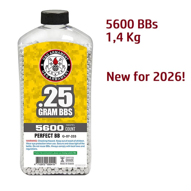 Pallini G&G Perfect 0,25g 5600pz in bottiglia da 1,4kg. Munizioni di qualità superiore per softair. Confezione da 5600 pallini in bottiglia da 1,4kg, specificamente formulati per garantire precisione e consistenza nelle canne di precisione. Questi pallini offrono traiettorie stabili e affidabili, ideali per chi ricerca performance elevate in campo. La loro composizione uniforme assicura velocità di uscita costante e riduce le deviazioni balistiche. Perfetti per competizioni e allenamento intensivo, rappresentano lo standard di eccellenza nel settore dell'airsoft.