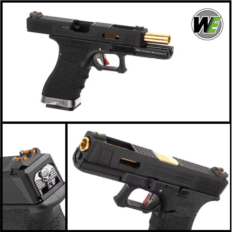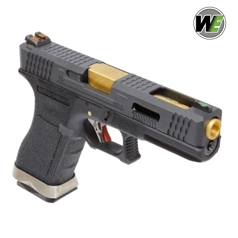 Pistola a Gas Glock G17 WE Custom Gold. Replica a Gas Blowback della serie G-Force con carrello nero e canna esterna dorata. Modello Customizzato dalla casa madre WE che rende questa Glock ( già apprezzata da chi pratica softair per via della sua compattezza e manovrabilità nell'utilizzo) ancora più performante. In questo modello troviamo delle modifiche sia nell'estetica del prodotto che nella meccanica. La replica si presenta con un carrello alleggerito in metallo lavorato con macchinari ad alta precisione , logo con Teschio e serigrafie incise fanno da padrona e rendono questa Glock molto accattivante, inoltre è dotata di tacche di mira con fibra ottica che danno una migliore precisione di tiro anche con scarsa luminosità, Grip lavorata con stile Texture per una migliore presa ed ergonomia, parte finale con magwell in alluminio che bilancia perfettamente l'arma. Meccanicamente questa Pistola a Gas Glock G18C WE - G-Force Nera e Silver possiede valvole di ultima generazione che permettono una pressione costante anche a basse temperature, la Glock g18C è dotata anche di un gruppo hop up regolabile e di un grilletto a corsa corta con sicura integrata di colore Rossa. Il funzionamento della pistola a gas è identico a quello reale ovvero: Inserisci il gas nel caricatore tramite valvola posta sotto nella basetta (Circa 5/6 sec.)metti i pallini facendo attenzione ad inserirli correttamente ( il caricatore è bifilare quindi ne andrà una a destra e uno a sinistra), il passo successivo è inserire il caricatore facendo attenzione e scarrellare il primo colpo ( per armare il cane interno ed inserire il pallino in canna ) e da li si può sparare in semiautomatico o full auto fino a quando non rimane il carrello in posizione aperta per indicare che sono finiti i colpi.