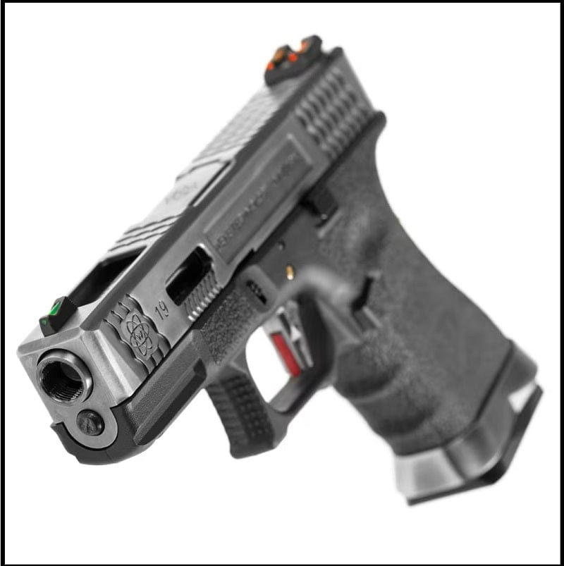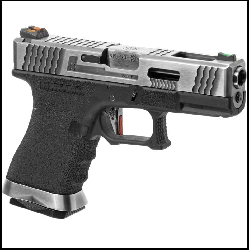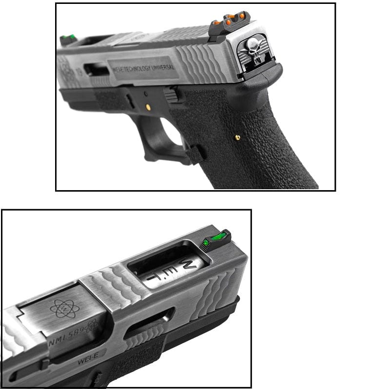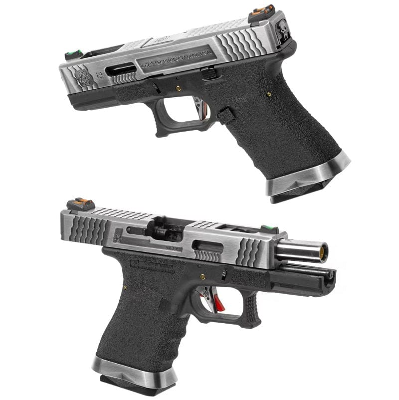 Pistola a Gas Glock G19 WE G-Force Carrello Silver. Modello Customizzato dalla casa madre WE che rende questa Glock ( già apprezzata da chi pratica softair per via della sua compattezza e manovrabilità nell'utilizzo) ancora più performante. In questo modello troviamo delle modifiche sia nell'estetica del prodotto che nella meccanica. La replica si presenta con un carrello alleggerito in metallo lavorato con macchinari ad alta precisione , logo con Teschio e serigrafie incise fanno da padrona e rendono questa Glock molto accattivante, inoltre è dotata di tacche di mira con fibra ottica che danno una migliore precisione di tiro anche con scarsa luminosità, Grip lavorata con stile Texture per una migliore presa ed ergonomia, parte finale con magwell in alluminio che bilancia perfettamente l'arma. Meccanicamente questa Glock possiede valvole di ultima generazione che permettono una pressione costante anche a basse temperature, la Glock g19 è dotata anche di un gruppo hop up regolabile e di un grilletto a corsa corta con sicura integrata di colore Rossa. Il funzionamento della pistola a gas è identico a quello reale ovvero: Inserisci il gas nel caricatore tramite valvola posta sotto nella basetta (Circa 5/6 sec.)metti i pallini facendo attenzione ad inserirli correttamente ( il caricatore è bifilare quindi ne andrà una a destra e uno a sinistra), il passo successivo è inserire il caricatore facendo attenzione e scarrellare il primo colpo ( per armare il cane interno ed inserire il pallino in canna ) e da li si può sparare in semiautomatico fino a quando non rimane il carrello in posizione aperta per indicare che sono finiti i colpi.