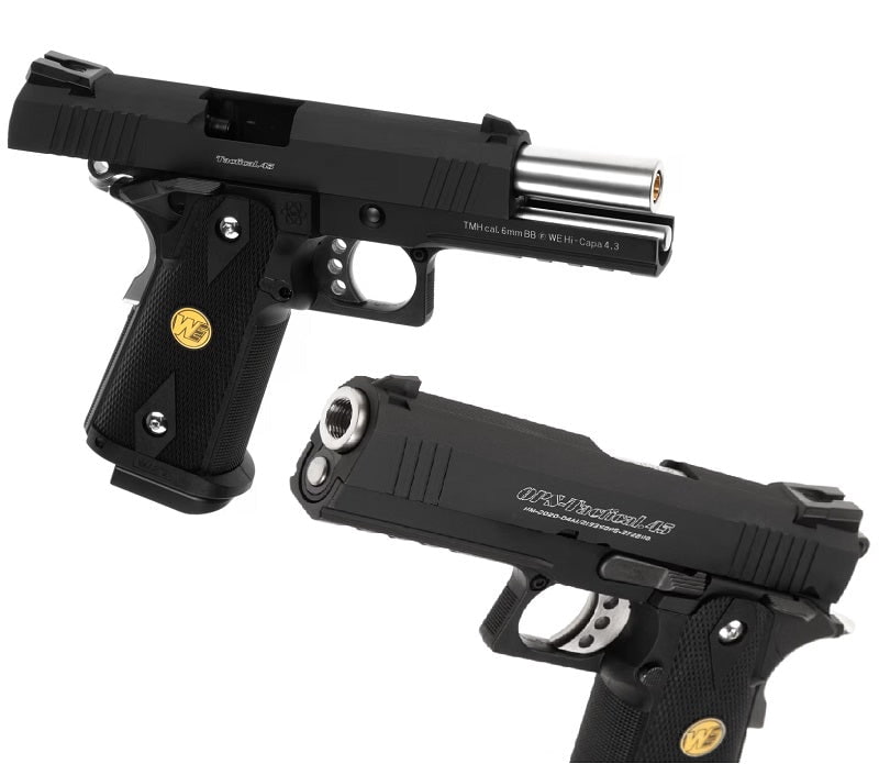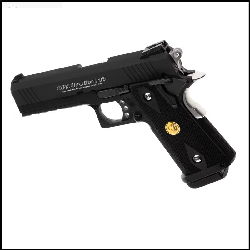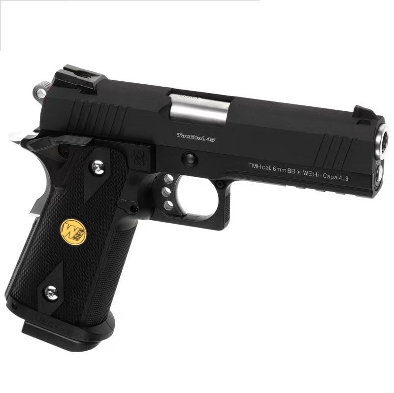 Pistola a Gas Hi-Capa 4.3 Ops Blowback 2025 Black, fantastica replica da Softair che funziona con tutti i tipi di Gas alte prestazioni. La Hi-Capa 4.3 Ops Tactical 45 della We è realizzata interamente in Metallo, con impugnatura rivestita in Gomma antiscivolo, la pistola è scarrellante e molto realistica. La replica Hi Capa è dotata di hop up regolabile e caricatore maggiorato da 28bb, può supportare caricatori a Gas e Co2 senza bisogno di effettuare modifiche.