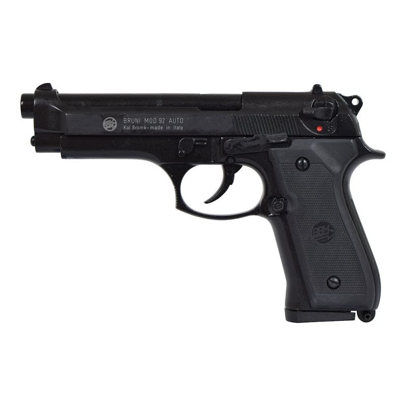 Pistola a Salve 92 Replica Beretta Scacciacani Calibro 9mm - Bruni. La Pistola a salve Bruni 92 replica fedele della celebre Beretta M92, ideale per difesa personale e deterrente contro animali. Calibro 9mm, libera vendita e completamente legale in Italia. Meccanismo affidabile e robusto, modalità di sparo automatica, progettata per prestazioni costanti. Viene utilizzata in altri contesti come l'addestramento cinofilo, le simulazioni militari e di polizia, le rievocazioni storiche e la produzione cinematografica/teatrale o come pistola starter nelle varie competizioni. Meccanismo molto realistico in quanto i colpi vengono espulsi dal carrello in movimento azionato dal Bossolo.