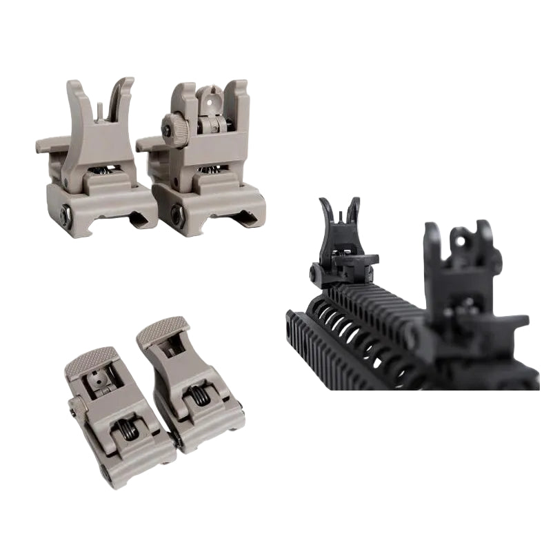 Tacche di Mira 71L F/R Flip-Up FMA. Set Tacche di mira pieghevoli FMA modello 71L con design flip-up anteriore e posteriore. Realizzate in nylon polimero resistente, colore Dark Earth. Compatibili con slitte Weaver da 20mm. Perfette per configurazioni tattiche su fucili e carabine softair. Leggere e affidabili, garantiscono una rapida transizione tra posizioni di tiro.