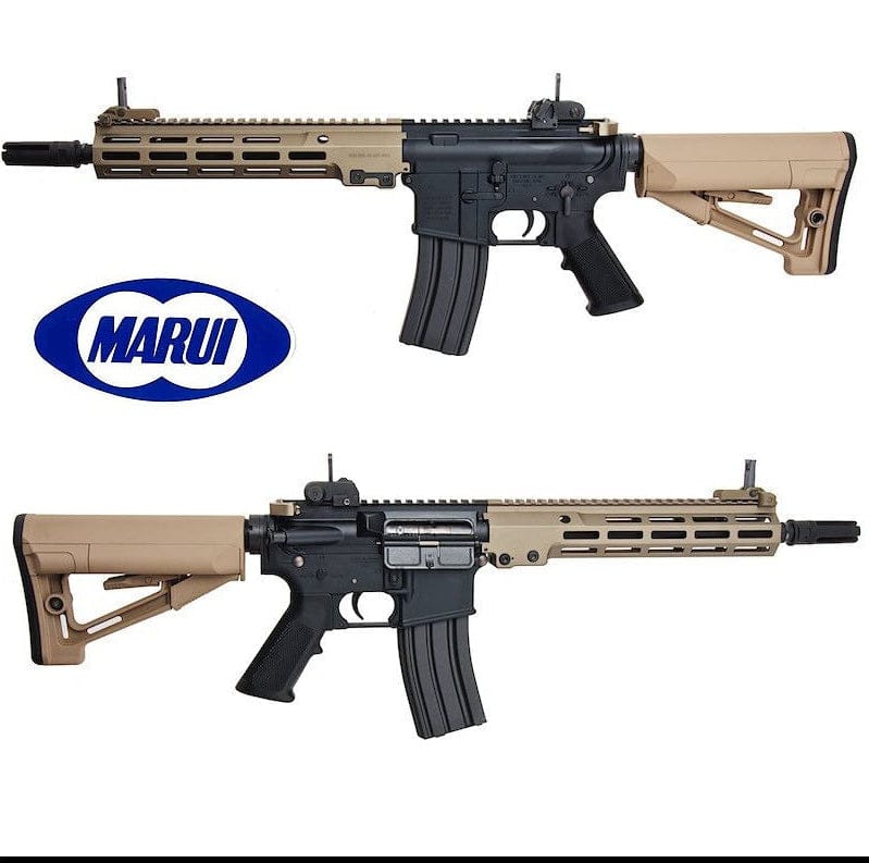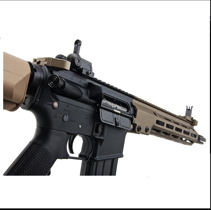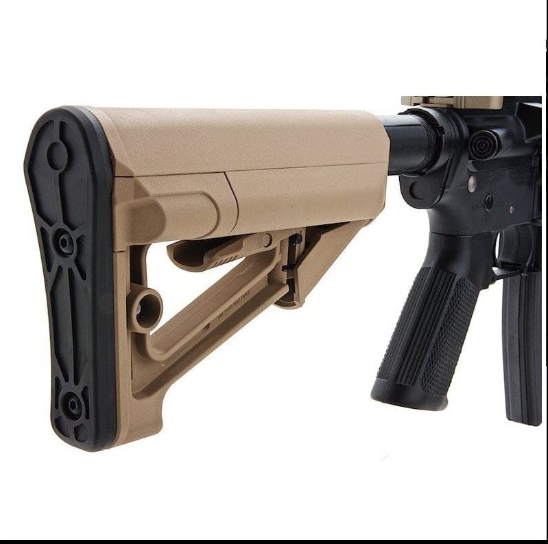 Tokyo Marui NGRS URG-I Sopmod Block 3 Fucile Elettrico Fde. Nuova Replica da Softair, modello equipaggiato con il nuovissimo upper receiver da 11,5 pollici (URG-I), utilizzato dai "Berretti Verdi" delle Forze Speciali dell'Esercito degli Stati Uniti a partire dal 2019, è parte integrante della nuova generazione di fucili elettrici! Si tratta di un modello sofisticato che segue le specifiche esclusive dell'URG-I, tra cui un'astina che riproduce fedelmente l'arma reale e ne riproduce la forma unica. Premendo il grilletto, il peso che imita l'otturatore si attiva contemporaneamente allo sparo e il forte rinculo generato all'interno del corpo principale viene trasmesso a tutto il corpo. Inoltre, un sistema di arresto automatico interrompe il fuoco quando il caricatore è vuoto. È un modello che persegue la realtà del funzionamento e dell'operatività. Il Fucile SRE è dotato di mirino anteriore, regolabile in alto e in basso, e la tacca di mira posteriore, regolabile in alto, in basso, a sinistra e a destra, sono ripiegabili per consentire l'uso di mirini ottici. Inoltre, poiché è montato tramite la guida di montaggio, la posizione di montaggio può essere modificata e può essere agganciato e sganciato. La slitta M-LOK da 20 mm di larghezza (standard Picatinny) è dotata di 3 tipi di slot: 3, 5 e 7. Può essere facilmente fissata e sganciata con la chiave esagonale inclusa. Per vari componenti, come i paramani della slitta, le canne esterne, i tubi buffer e i rompifiamma, vengono utilizzati materiali metallici, che le conferiscono un peso realistico. Pur adottando una canna completamente flottante, in cui il paramano non interferisce con la canna, offre una rigidità che la rende sicura per l'uso in selvaggina. Compatibile con diverse opzioni di volata, rimuovendo il rompifiamma dalla volata è possibile installare un'opzione di volata con vite di inversione da 14 mm, come un silenziatore o un'unità tracciante.